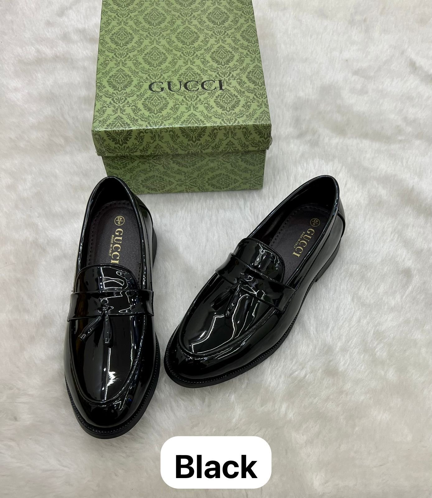 Designed with precision stitching, soft inner cushioning, and a sleek slip-on profile, these shoes offer unmatched comfort for long hours of wear. Perfect for business meetings, weddings, and evening events, the Gucci Black Patent Leather first copy loafers are the ultimate statement of style and confidence.